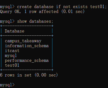 那我现在再创建一个不存在的数据库,命名为test01 创建后再查看