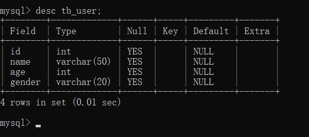 那么现在如果还想知道这张表里的所有字段,就通过下面的方法(即3.查询表结构中的所有字段)