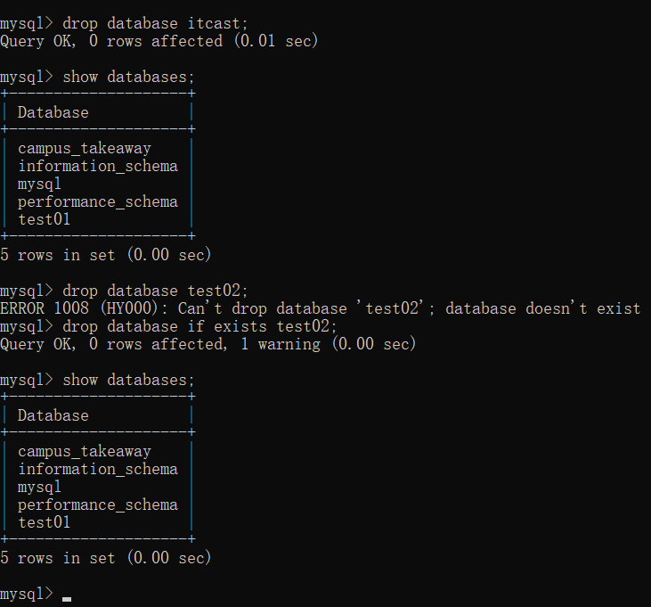 然后尝试删除不存在的数据库test02,发现会在下一行进行报错