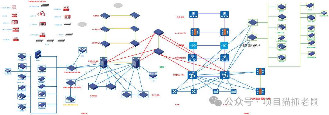 各区域之间通过防火墙、交换机、网闸等设备进行隔离与连接,形成完整的"边界防护 → 核心控制 → 内部管理 → 安全审计"闭环体系。