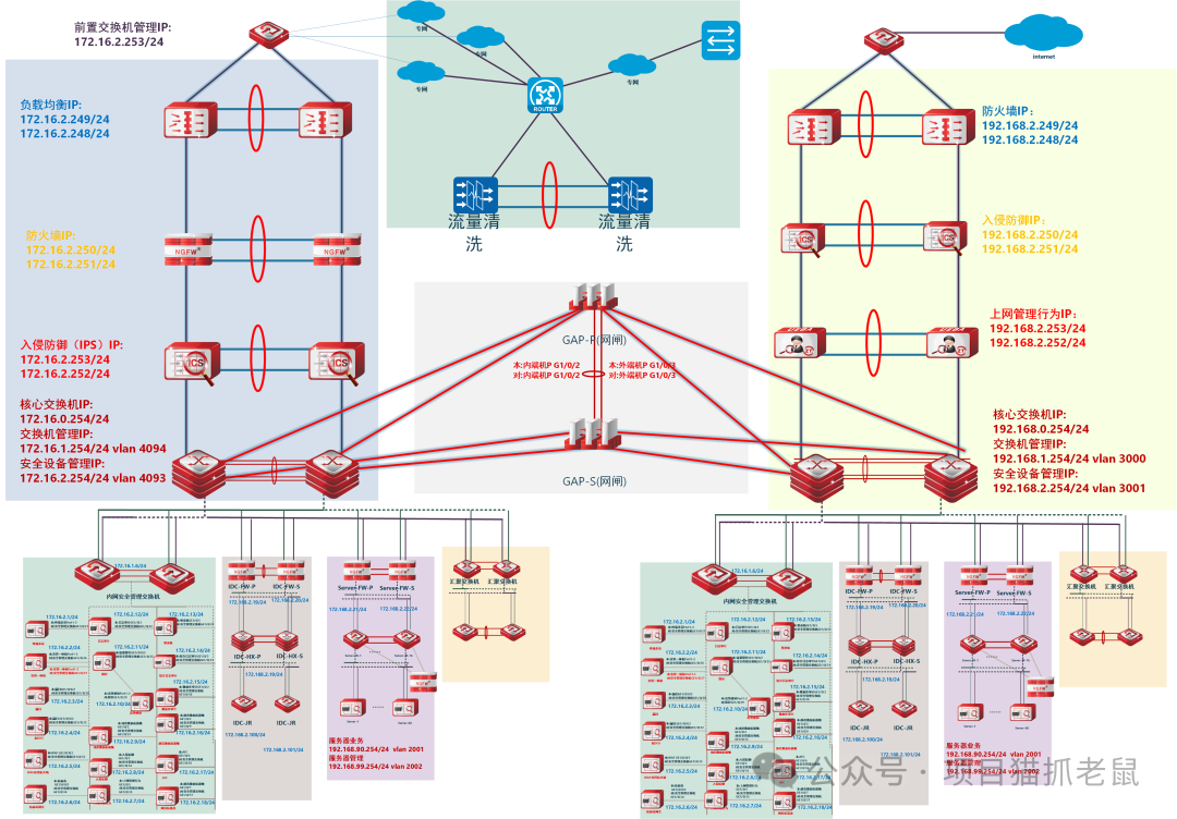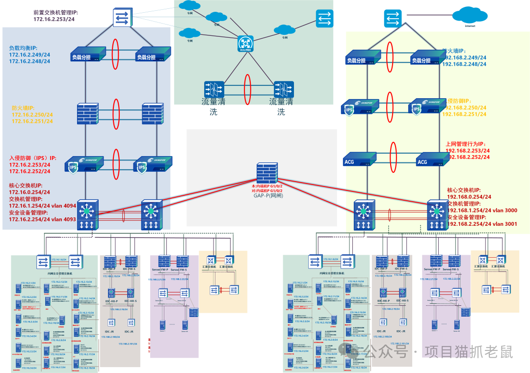 这张图展示了一个大型企业或数据中心的网络安全架构拓扑图,采用"分区分域、纵深防御、双活高可用"的设计理念。整体结构清晰,安全防护全面,适用于对安全性、稳定性和合规性要求较高的场景(如政府、金融、能源等行业)。