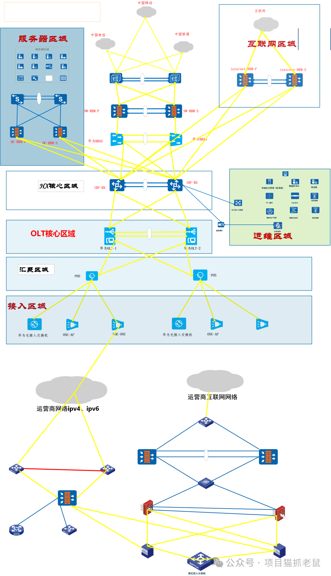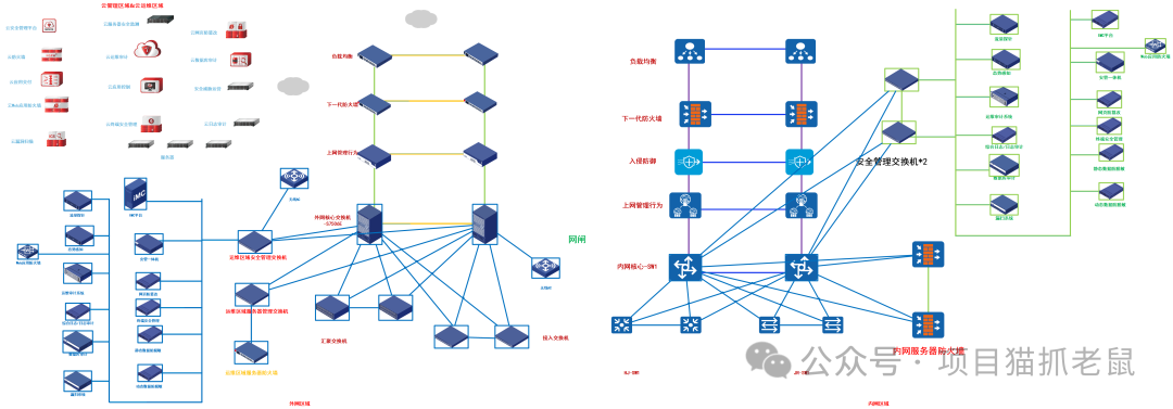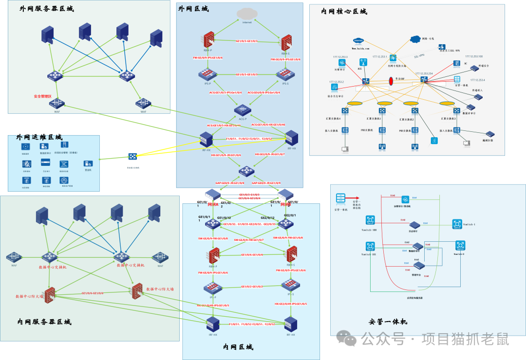这些区域之间通过边界防火墙、核心交换机、安全设备等进行隔离与连接,体现了"分区分域、纵深防御"的安全理念。