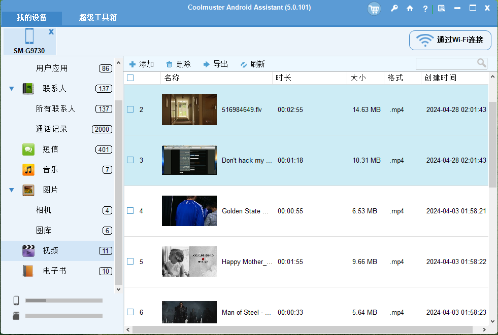 Coolmuster Android Assistant是一款将视频从 PC 传输到Android手机和平板电脑的完美应用程序。如果您的计算机上有多个重要视频,您可以一键将计算机上的所有视频同时添加到Android设备。此外,您还可以预览并选择性地将您想要的视频从计算机导入到Android 。它支持所有主流视频格式,如MP4、MOV、M4V、GIF、FLV、MPEG等。