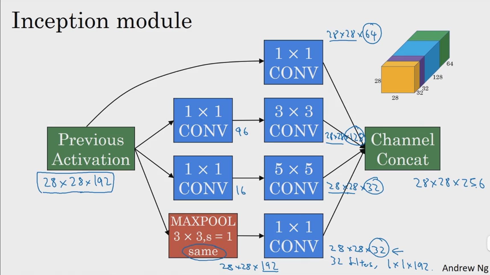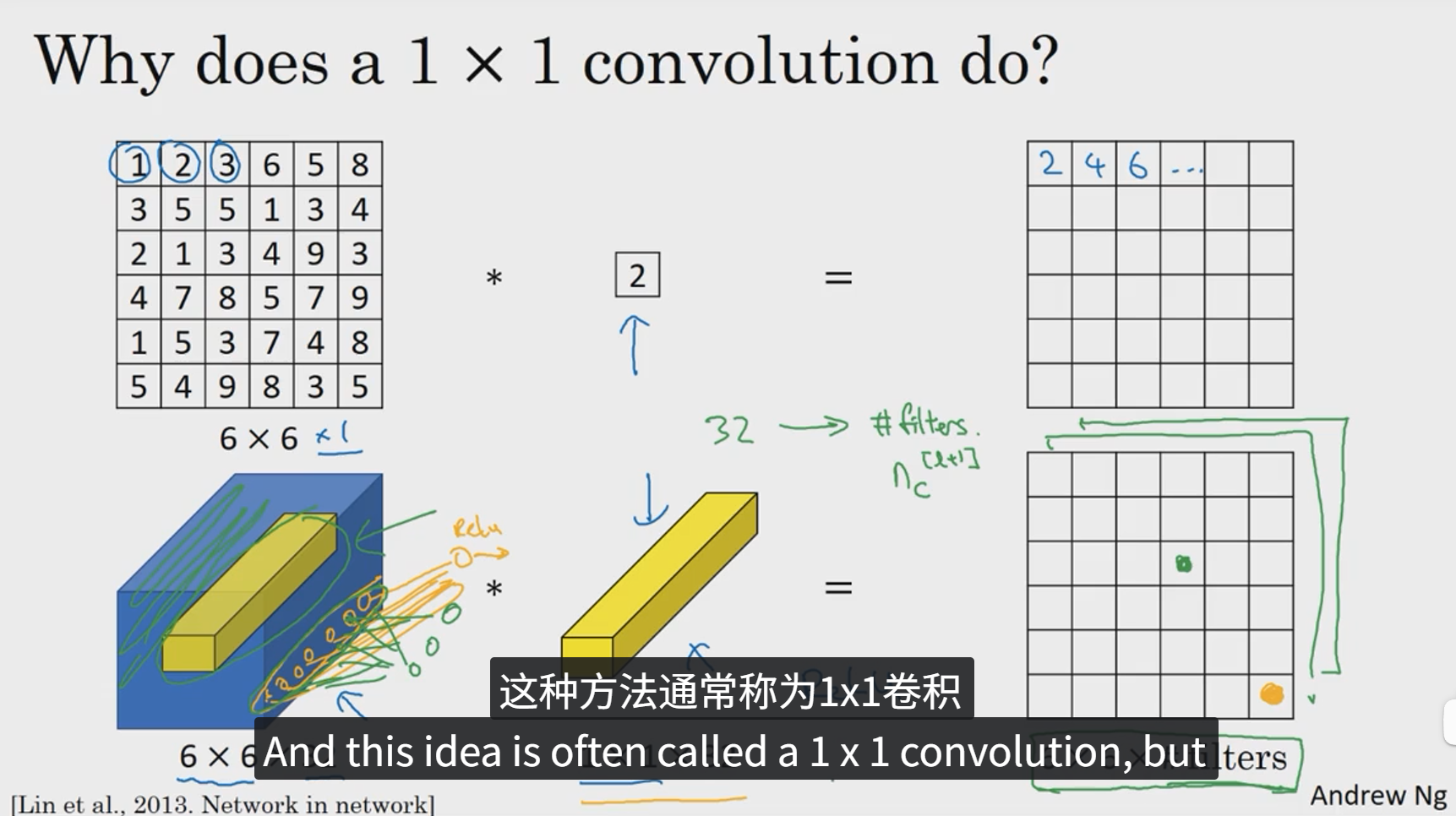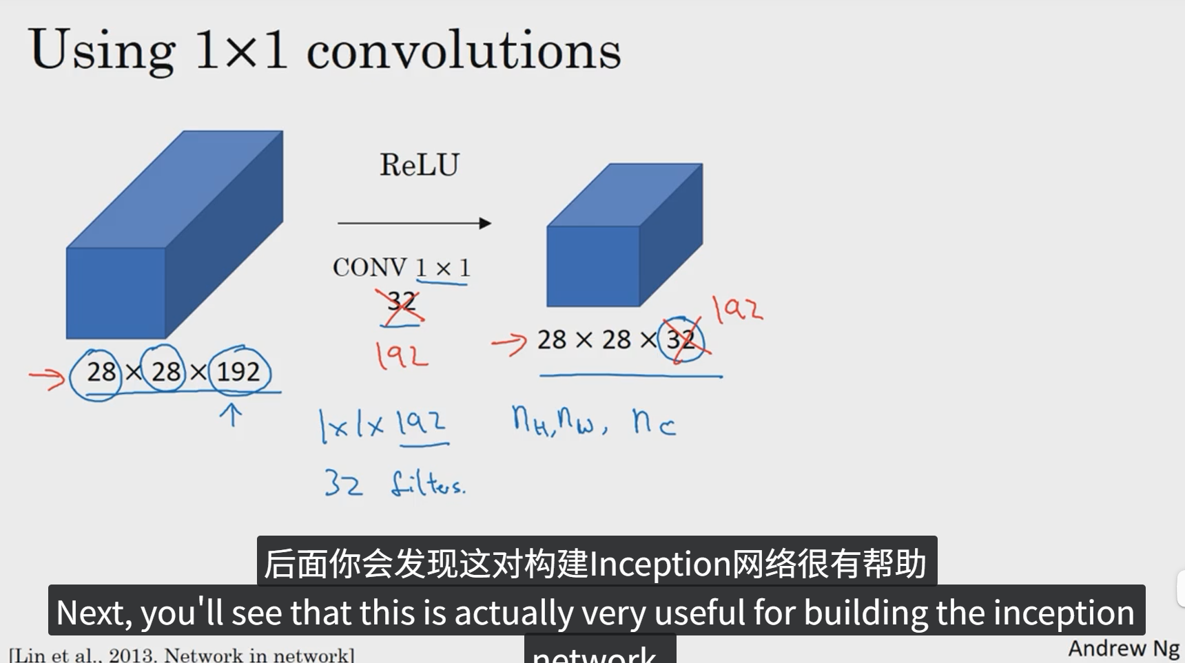 我们以其中一个单元格为例,它是这个输入层上的某个切片,用这32个数字乘以这个输入层上1x1的切片得到一个实数。这个1x1x32过滤器中的32个数字可以这样理解,一个神经元的输入是32个数字乘以相同高度和宽度上某个切片上的32个数字,这32个数字具有不同信道,乘以32个权重 然后应用ReLU非线性函数,在这里输出相应的结果。