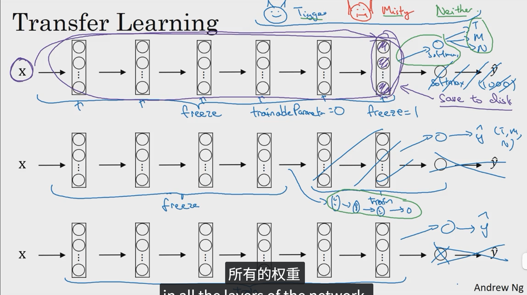 如果你有一个更大的数据集,那么不要单单训练一个softmax单元,而是考虑训练中等大小的网络,包含你最终要用的网络的后面几层。如果你有大量数据,你应该做的就是用开源的网络和它的权重,把整个的当做初始化,然后训练整个网络。