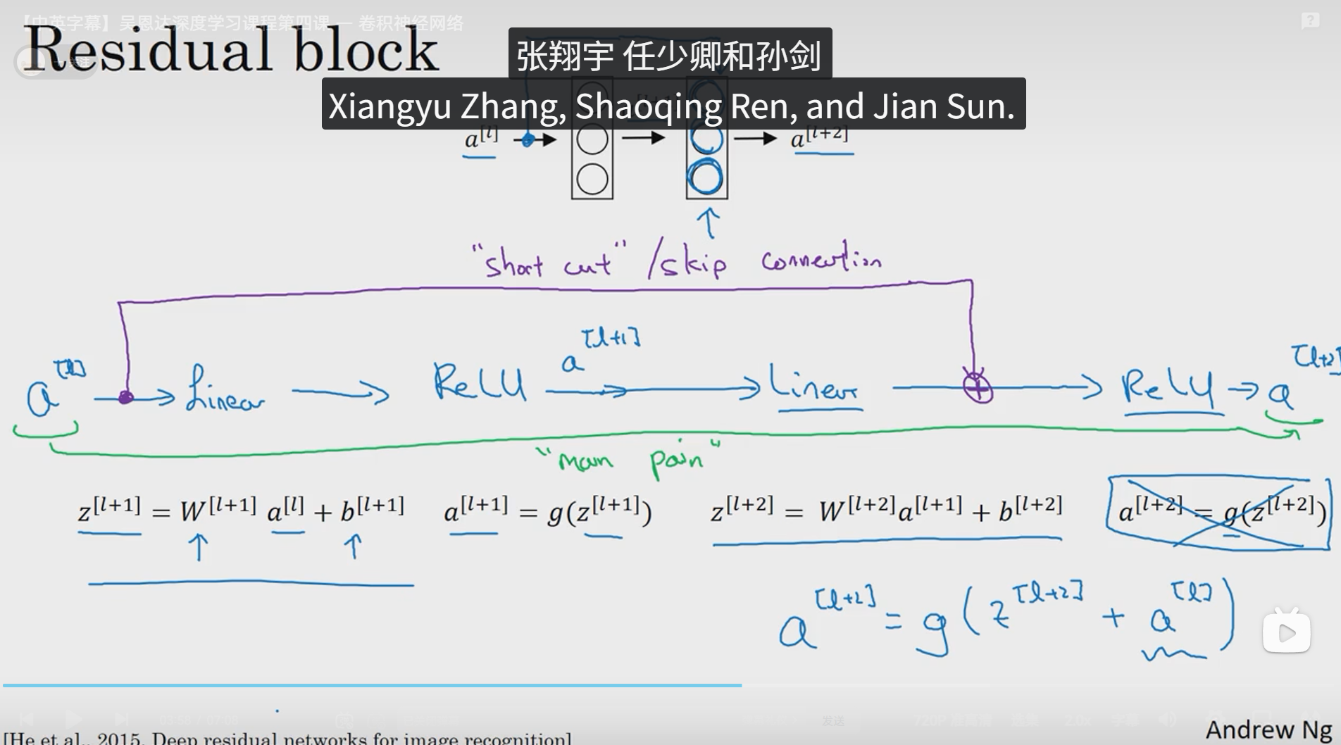从上面途中可以看到,下边的黑色字体的公式是正常的前向传播的过程,即 a[l] 通过第一层线性激活,第一层 ReLu 非线性激活,再进行第二层线性激活,第二层 ReLu 非线性激活最终得到 a[l+2] ,所谓残差块就是上图紫色的连接线和右下角的蓝色公式 a[l+2] = g(z[l+2] + a[l]) ,即在 a[l] 线性激活之前直接跳到 z[l+2] ReLu非线性激活之前,将 z[l+2] + a[l] 作为待激活值进行 ReLu 非线性激活,这一步也叫做远跳连接。