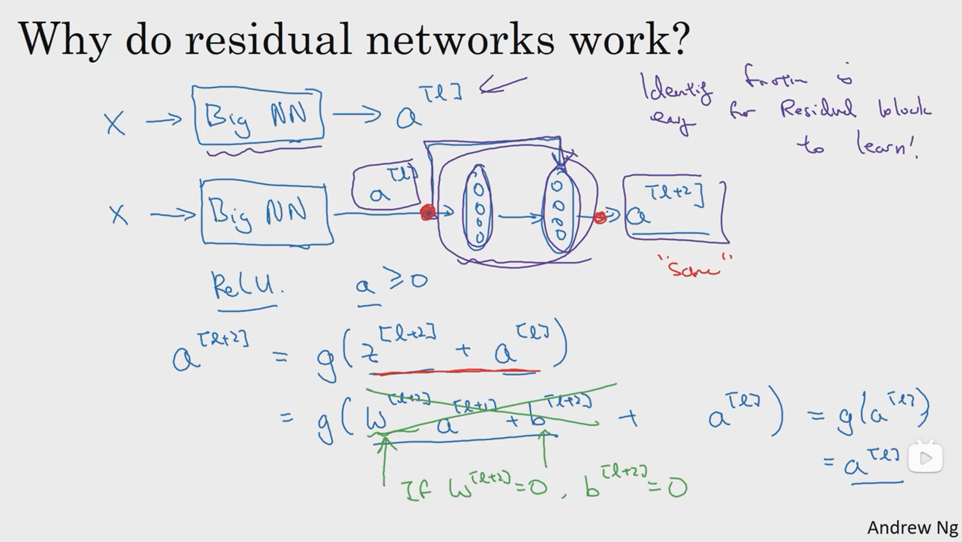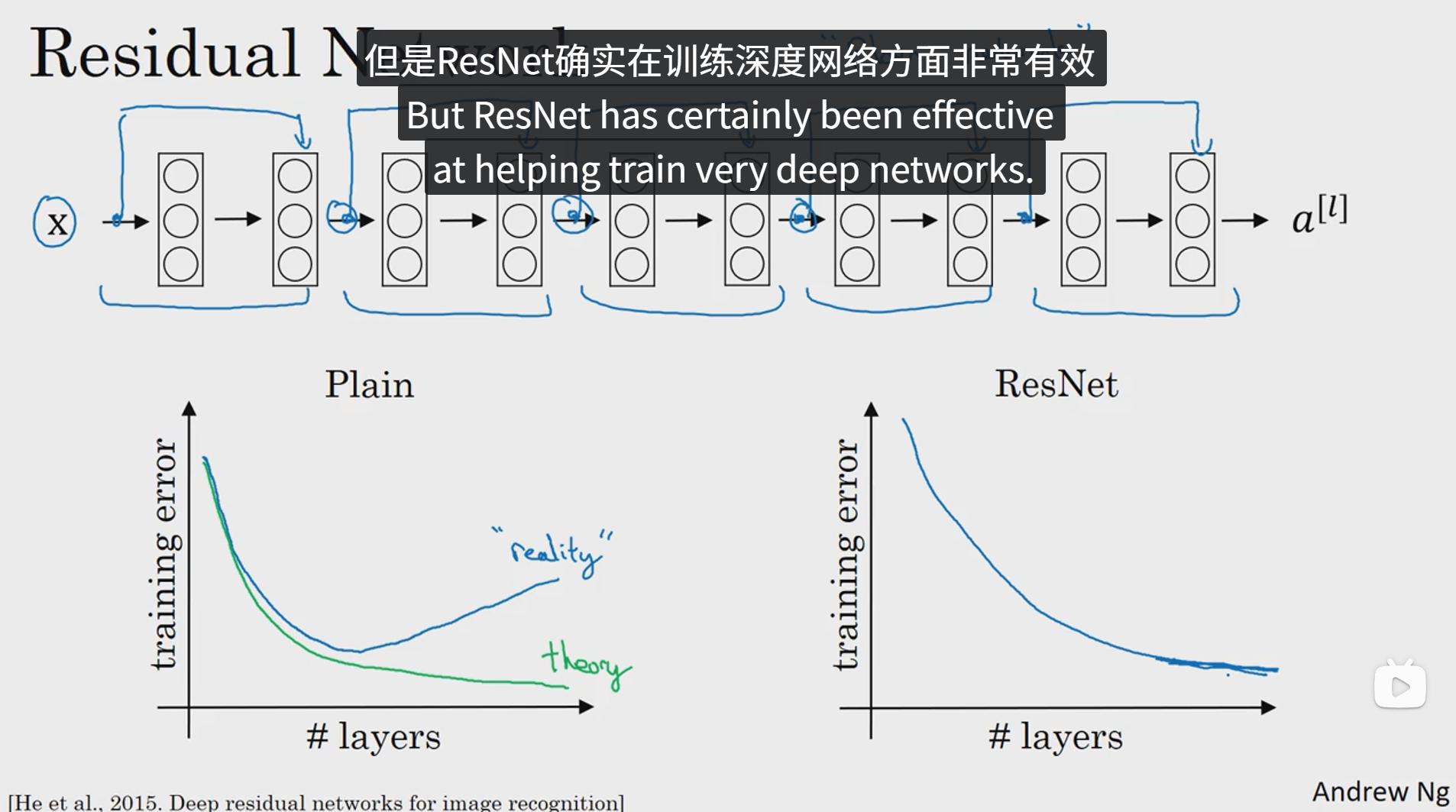 为什么 ResNet 能够有如此好的表现呢?让我们来看一个例子,它解释了其中的原因,至少可以说明,如何在构建更深层次的ResNet网络的同时还不降低它们在训练集上的效率。