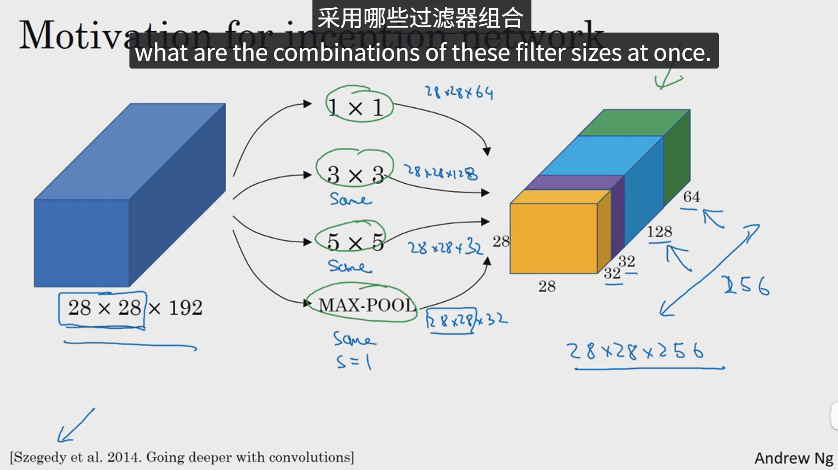基本思想是Inception网络不需要人为决定使用哪个过滤器或是否需要池化,而是由网络自行确定这些参数,你可以给网络添加这些参数的所有可能值然后把这些输出连接起来,让网络自己学习它需要什么样的参数,采用哪些过滤器组合。