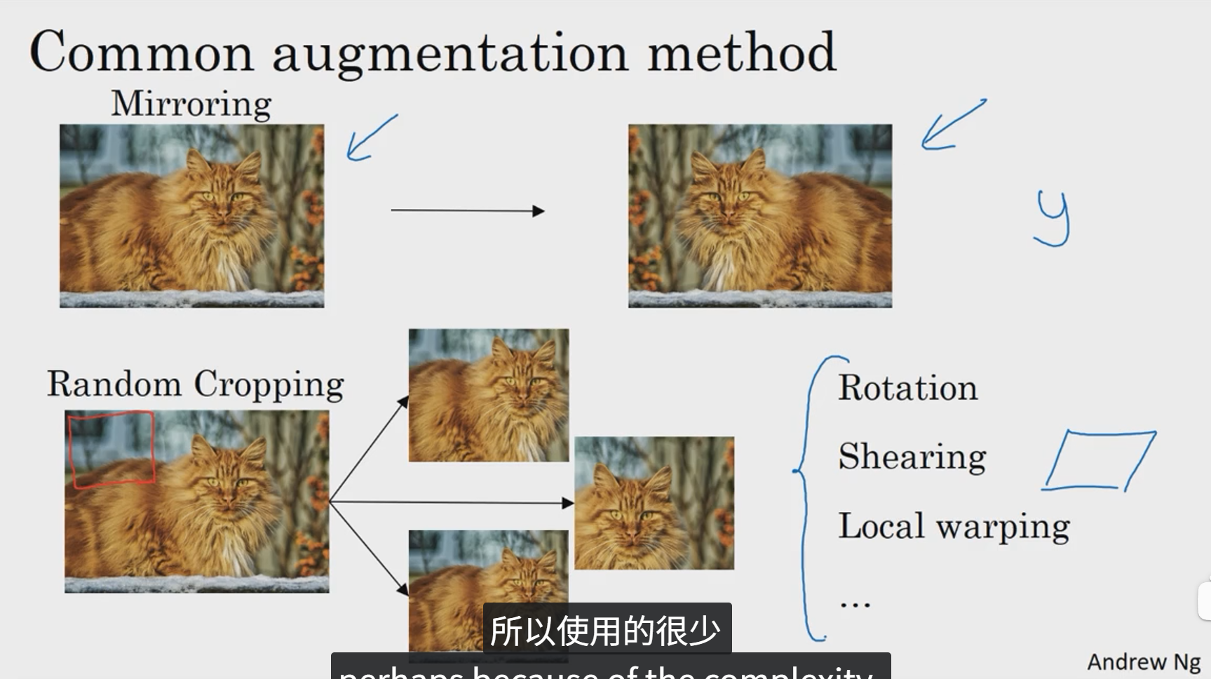 第一种数据增强方法就是垂直镜像对称。另一种数据增强操作是随即裁剪。理论上,也可以旋转、剪切图像,可以对图像进行各种各样的扭曲变换。