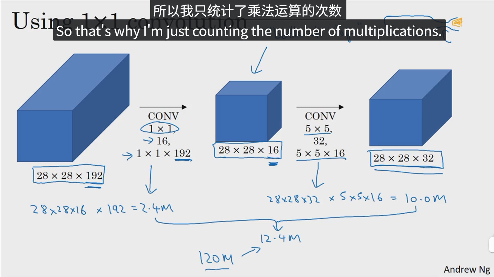 由此可以看出,1x1卷积把原来的图像通道进行了压缩,然后在压缩后的图像进行5x5卷积,这样我们把这两部分运算次数求出来并且加和,可以发现,最终的计算次数仅为12M,计算成本相比之前缩小了10倍,中间那层我们也称之为瓶颈层。