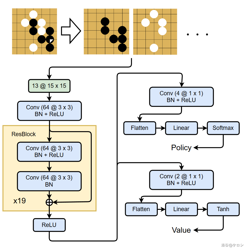 人类下五子棋的时候,经常注重三连四连,要不要堵,之后的变化。而刚刚的 MCTS 会探索所有的位置,这明显不太优秀,所以引入一个策略头,告诉 MCTS 倾向于探索哪些位置。