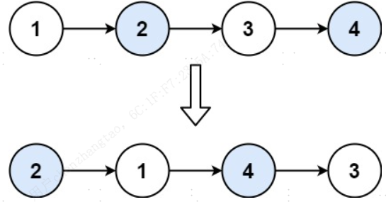 给你一个链表,两两交换其中相邻的节点,并返回交换后链表的头节点。你必须在不修改节点内部的值的情况下完成本题(即,只能进行节点交换)。