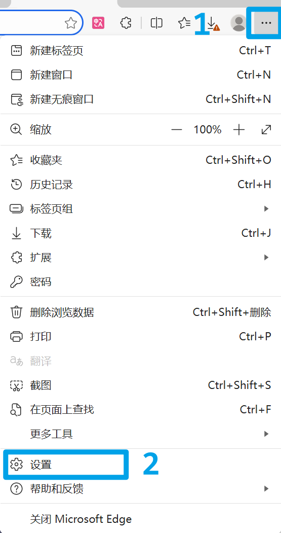 1.在Edge浏览器右上角三个点"设置及其他"(或使用Alt+F快捷键)选择"设置"