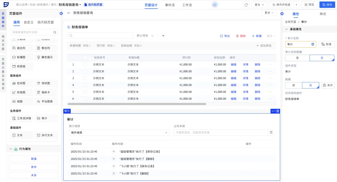 今天就带大家全面解锁飞搭页面设计器中的审计组件与审计节点的核心能力,主要包含: