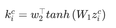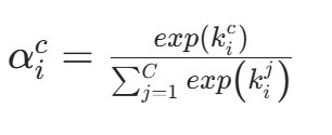 对第i个样本的第c个通道特征zic,通过 "线性变换 + 非线性激活 + 线性投影",计算出该通道的 "原始重要性分数"kic。 - Softmax 归一化权重: