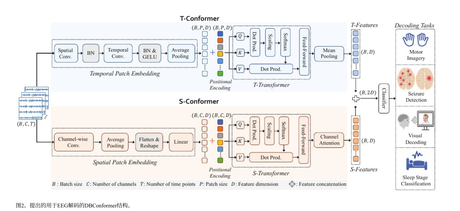 DBConformer 采用双分支并行结构,对称建模 EEG 信号的时间动态与空间模式,核心由 temporal Conformer(T-Conformer)、spatial Conformer(S-Conformer)、通道注意力模块及特征融合层组成,架构对比见下表: