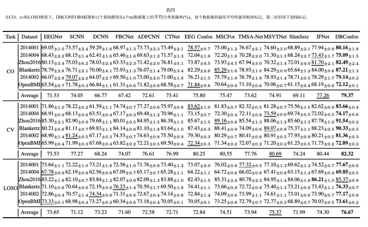 DBConformer 通过双分支并行架构、显式通道注意力机制,实现了 EEG 解码中局部 - 全局特征、时间 - 空间模式的高效融合。其核心贡献在于: