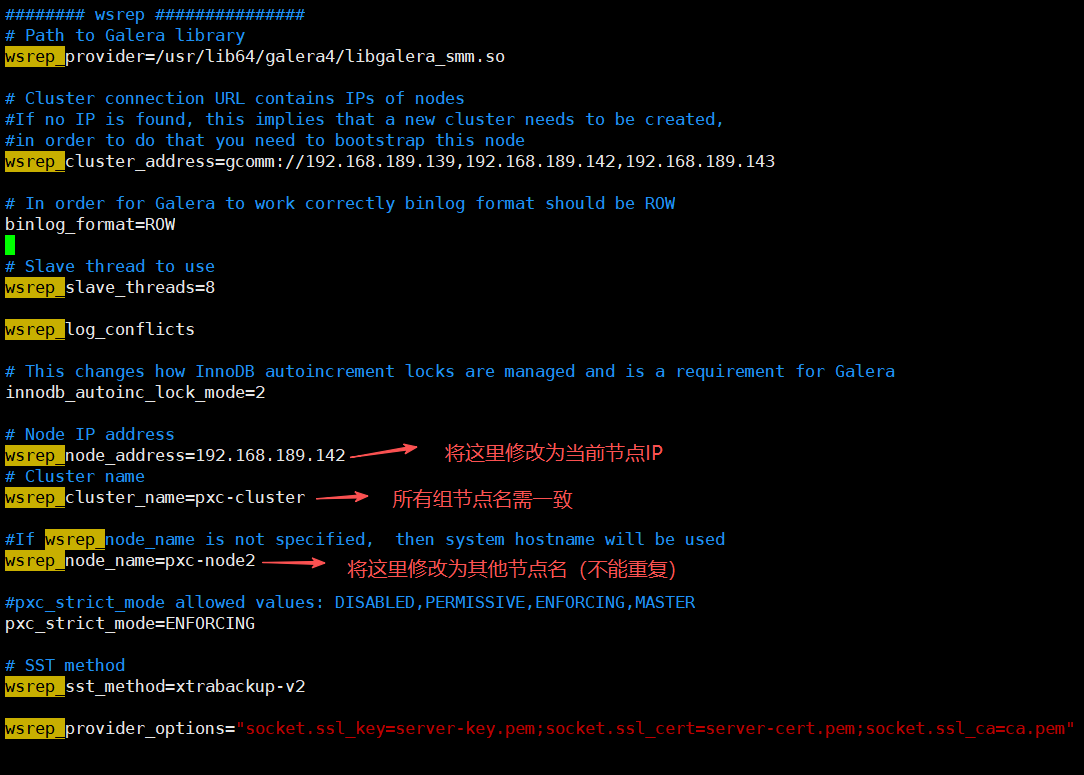 wsrep_cluster_name=pxc-cluster # 集群名,必须所有节点一致
