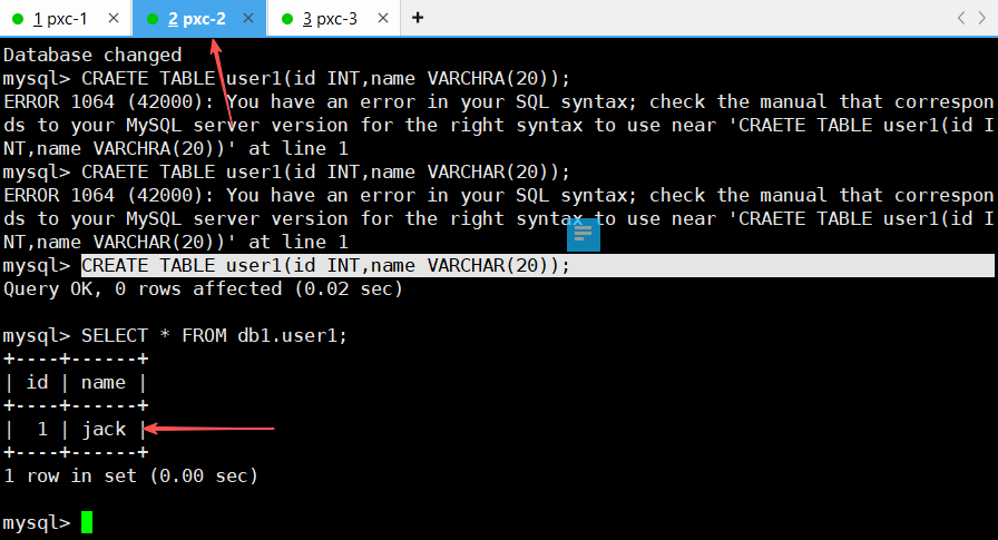 INSERT INTO db1.user1 VALUES(1,'jack');