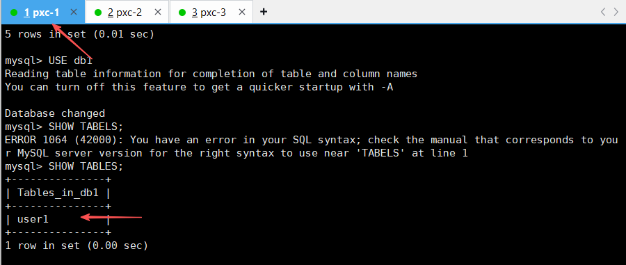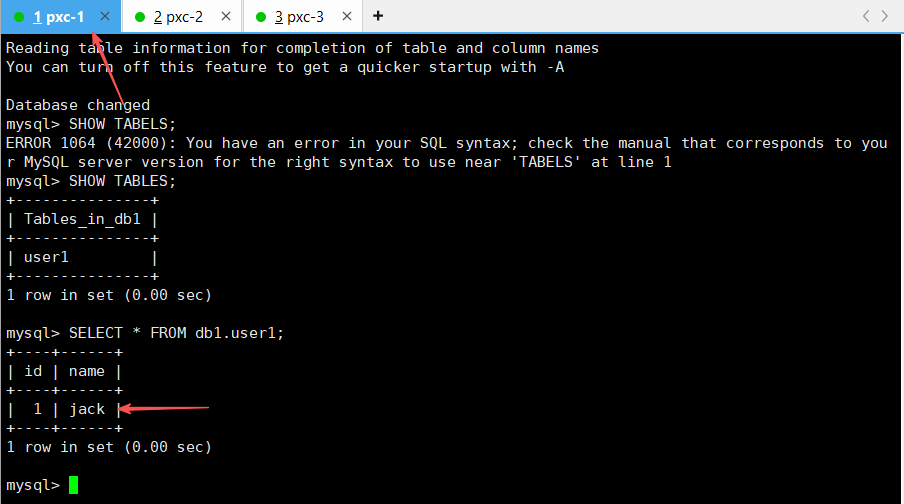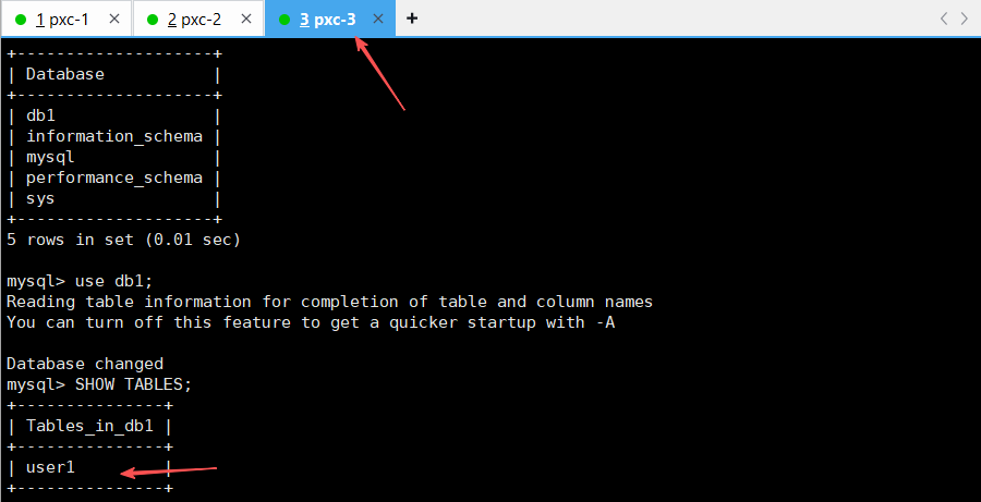 7.3使用pxc-node3插入数据(默认只能在有主键的表中插入数据)