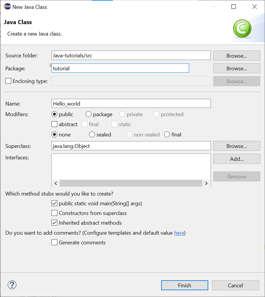 输入类名称(Name),复选main()方法,其他默认选项不,点击Finish。