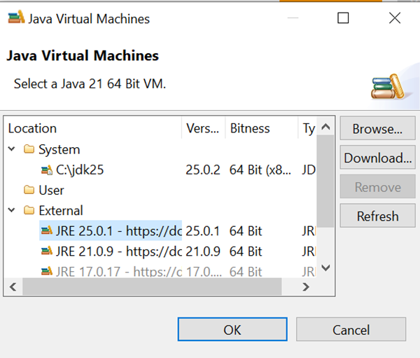 选择Java Virtual Machines(Java虚拟机)时,选择JDK 25.2(最新版本)。