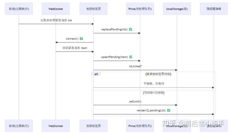 无论消息来自轮询还是 WS,都先进入这个队列;当某个标签页允许弹框时,再一次性把队列里的未处理消息渲染出来 ✅