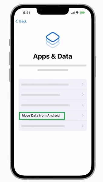 步骤 3. 在"应用和数据"屏幕上,选择"从Android移动数据"。