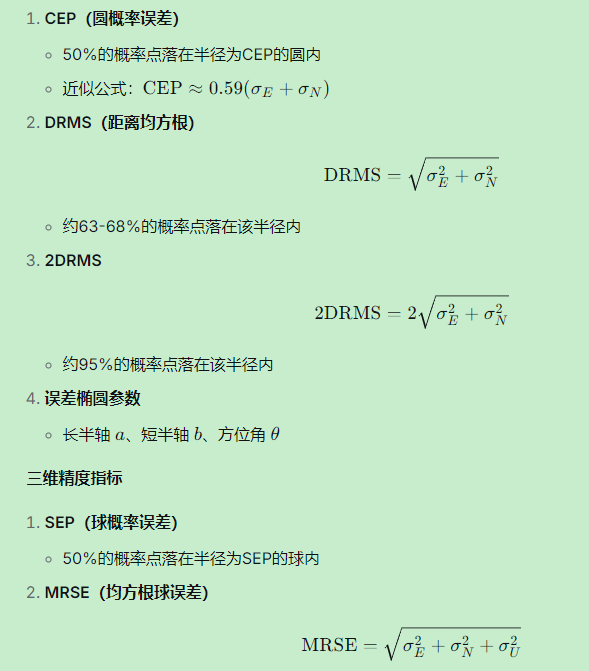 精度指标:CEP、DRMS等都是从误差椭圆/椭球导出的简化指标