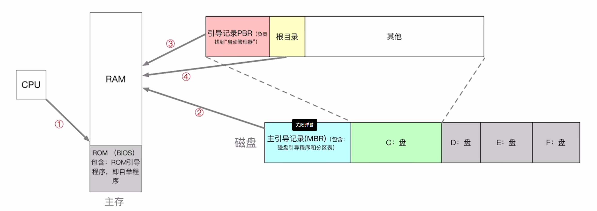 2.将磁盘的第一块------主引导记录读入内存,执行磁盘引导程序,扫描分区表