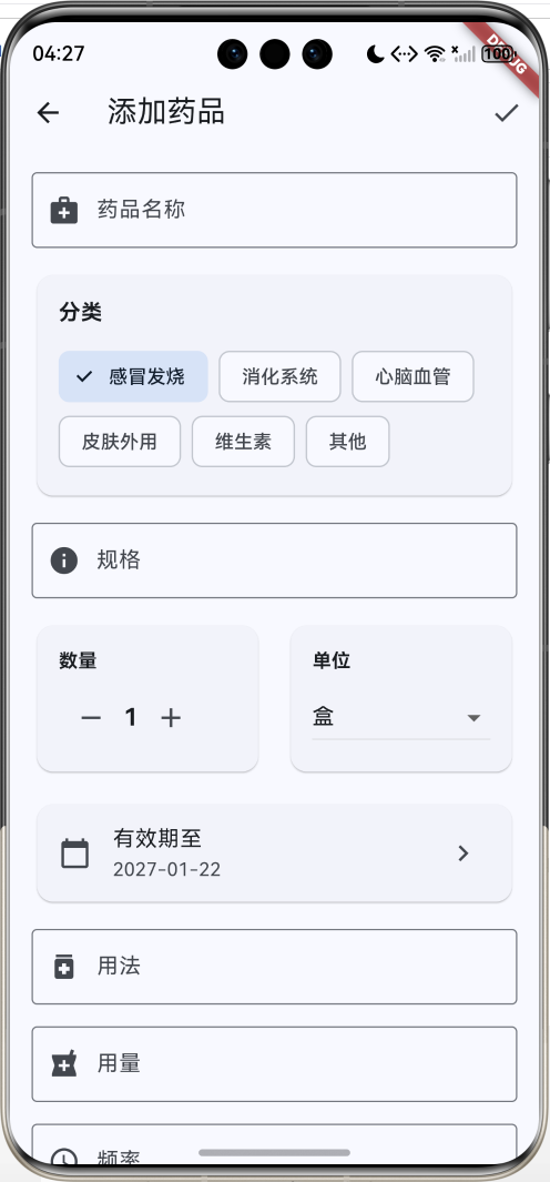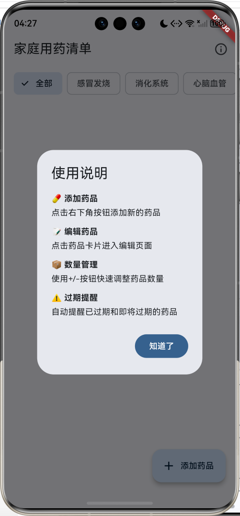 家庭用药清单是一款实用的Flutter应用,帮助家庭管理药品库存、追踪有效期、记录用药信息。通过智能提醒功能,避免使用过期药品,确保用药安全。