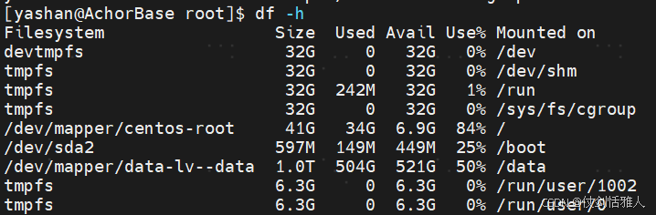 df** 是 "disk free" 的缩写,其核心功能就是显示文件系统的磁盘空间使用统计。 -h选项 (或--human-readable) 的作用是以 人类易读的格式 显示空间大小(如 K, M, G),而不是默认的磁盘块数。