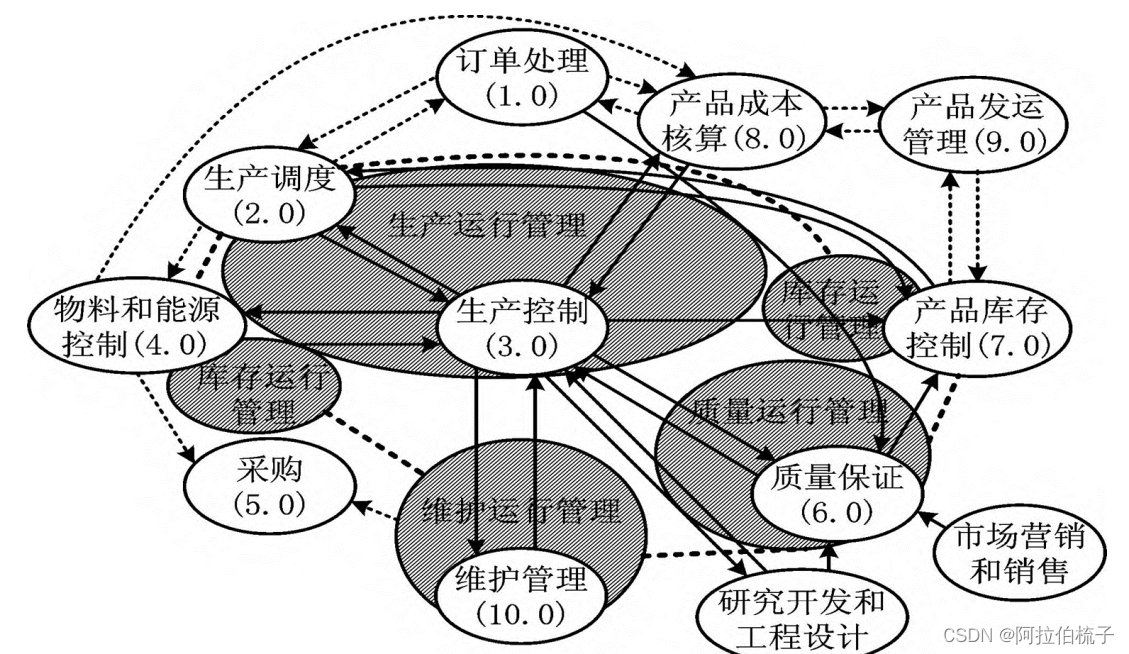图2中的粗虚线代表了企业的业务计划系统与制造运行系统之间的接口,即给出了制造运行管理的边界。白色椭圆和带箭头的实线段则分别代表企业中与生产制造相关的基本功能及各功能之间相互交互的信息。图2中的阴影区域则表示制造运行管理内部细分的4大类不同性质的区域,分别是:生产运行管理、维护运行管理、质量运行管理和库存运行管理。