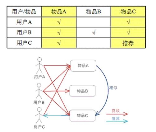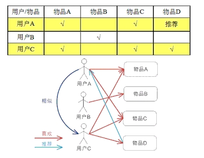 假设用户 A 和用户 C 的口味很像(都买了物品 A 和 C),那么用户 C 买了物品 D,我们猜测用户 A 也会喜欢物品 D。