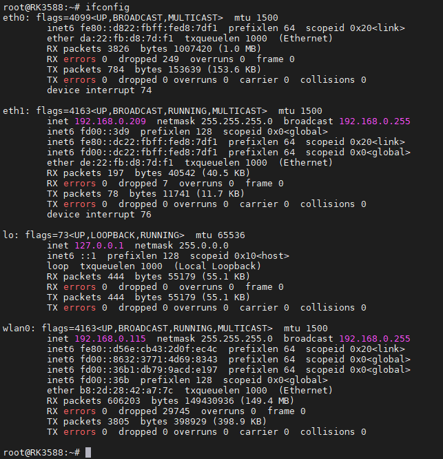 执行以下命令查看设备的IP地址(重点看eth0或wlan0的iP地址):