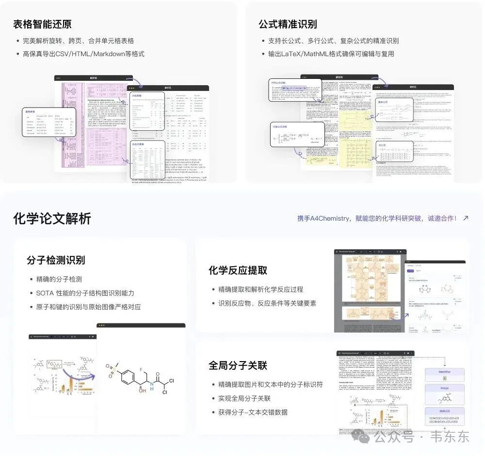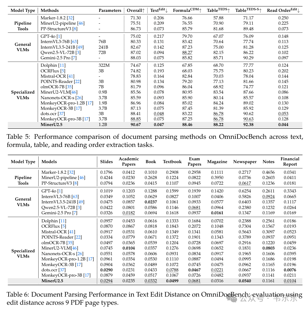 最后贴张官方公众号的一些解析效果汇总图示,总的来说这次MinerU2.5比较能打。但如果需要处理金融、法律等精确性要求极高的文档,还是不要完全依赖端到端视觉模型。