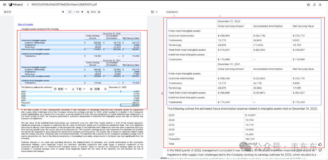 其次,对于财报中的复杂表格而言,传统模型往往输出结构散乱,而 MinerU2.5 能够完整保持原始表格结构。