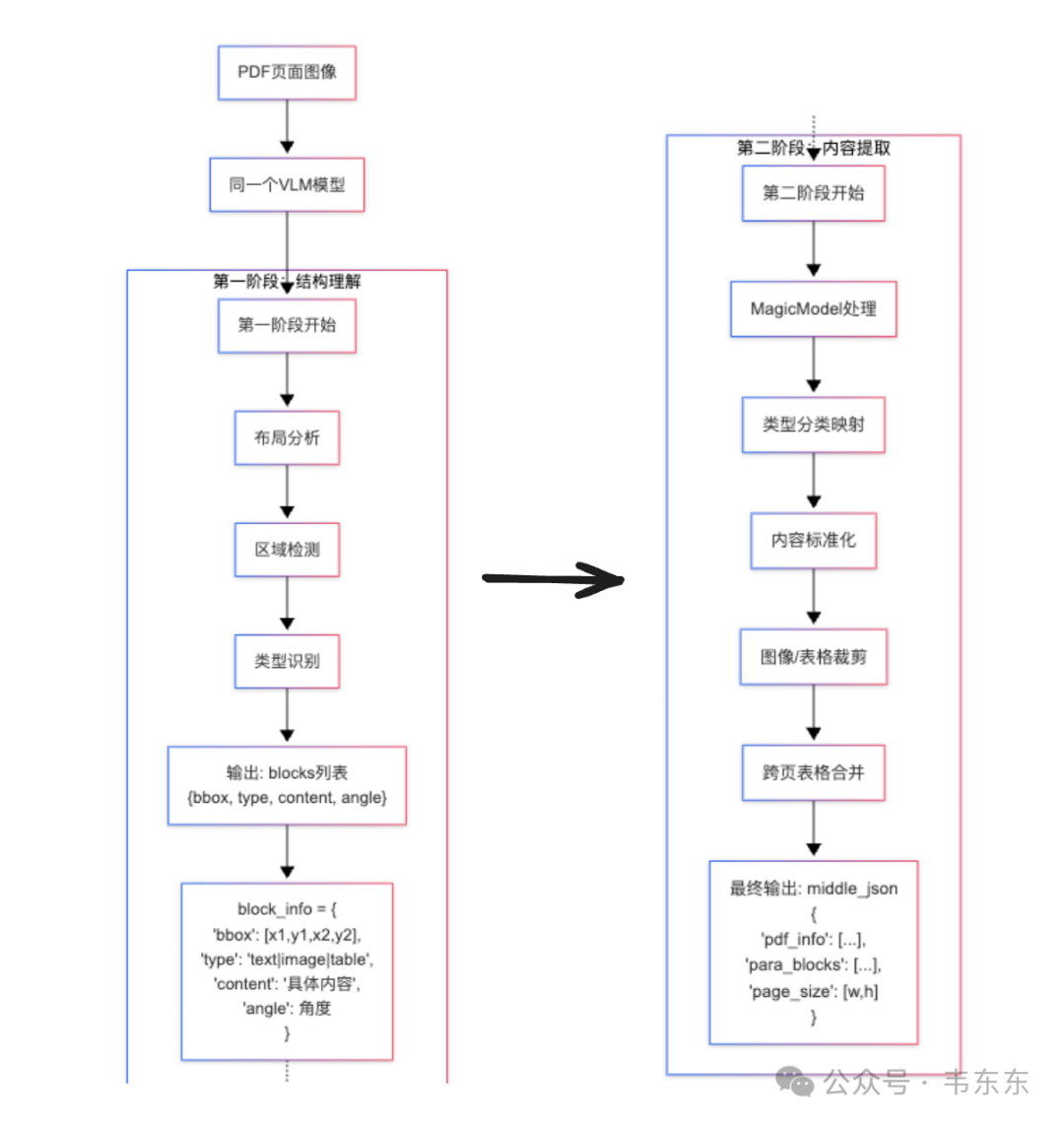 而 MinerU2.0 版本开始引入的 VLM 后端,选择了端到端的路线。也就是使用单一的视觉大模型处理整个文档解析流程。这种方式的核心优势是模型间的信息传递更加顺畅,避免了传统流水线中的误差累积问题。