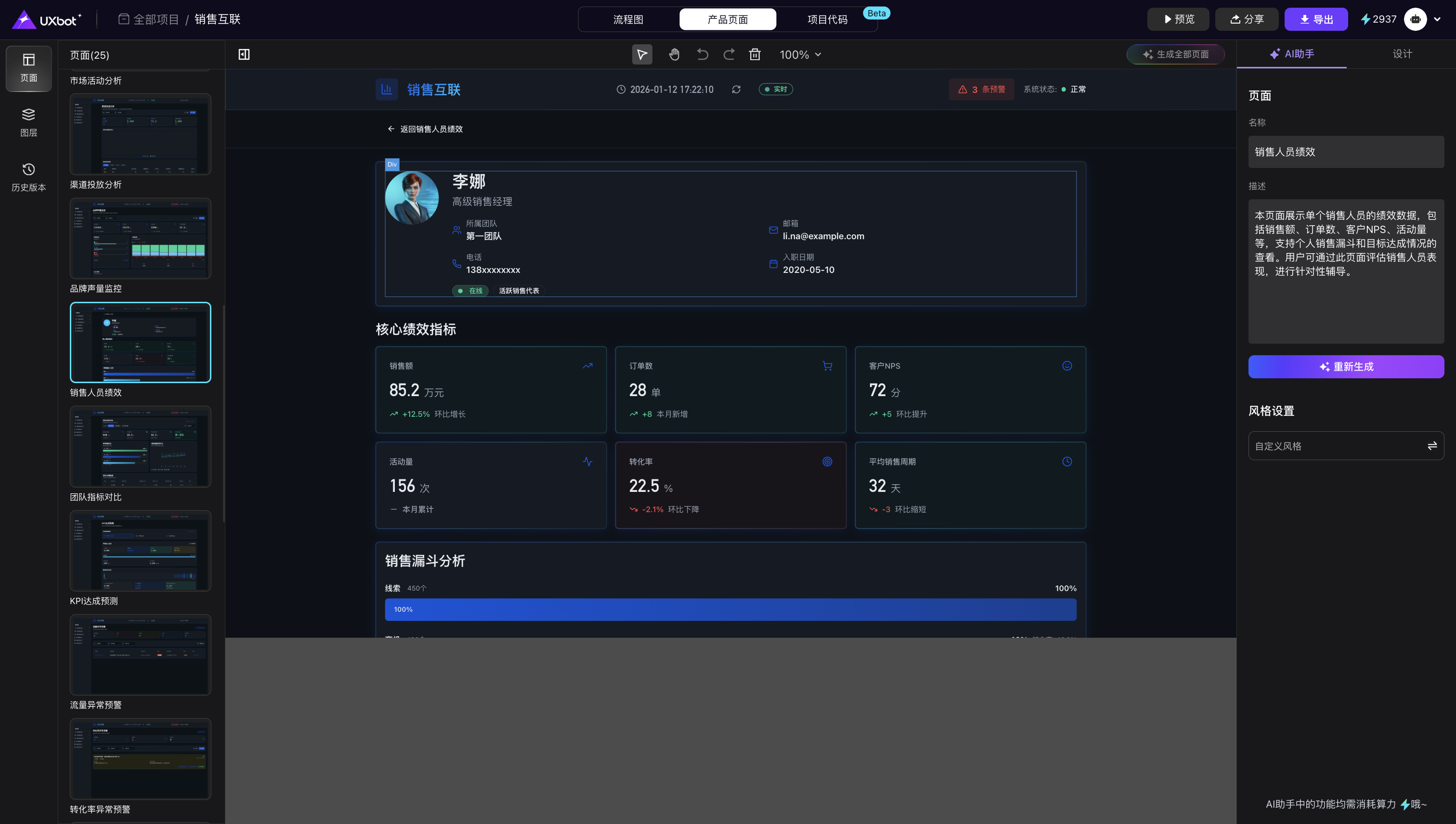 多页面项目生成:仅需提供文字描述,UXbot就能自动搭建起覆盖全流程的用户旅程图谱, 实时展现思考过程, 用户可以自主选择生成页面, 并一次性生成完整的、 可交互且逻辑连贯的产品原型设计;
