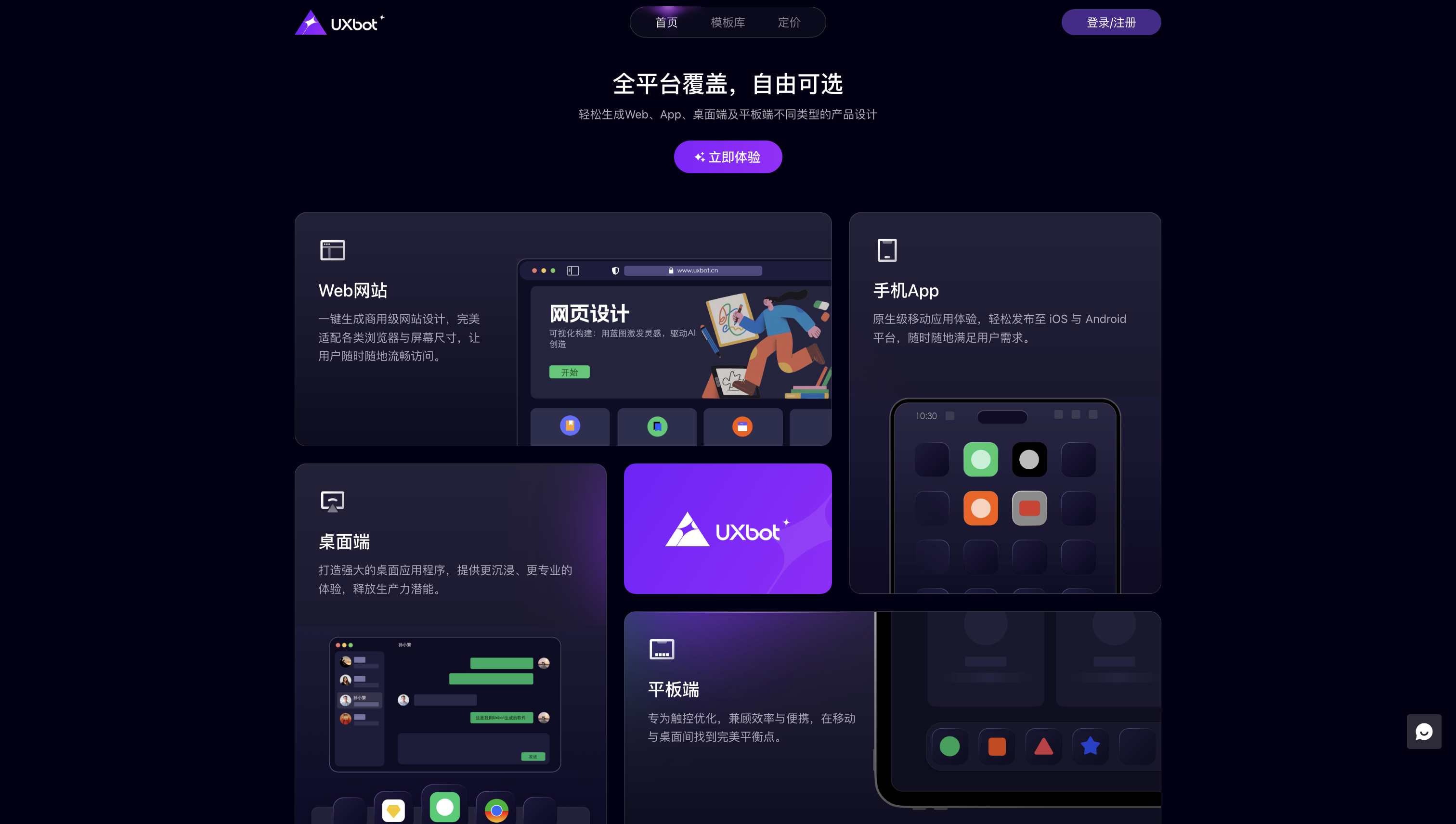 UXbot是一款AI驱动的综合性产品设计平台,实现从需求到可视化页面规划、高保真交互界面生成与项目级Web前端代码同步输出,适配Web、App、桌面端等多终端设计需求,无需专业设计或开发基础也能快速上手。