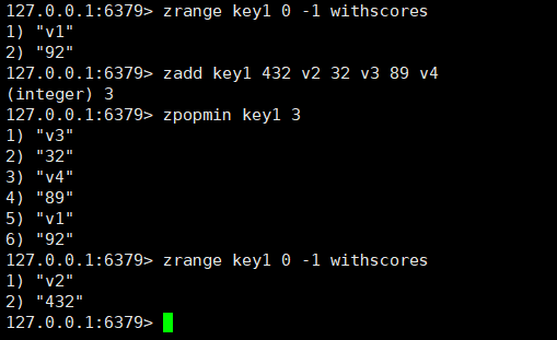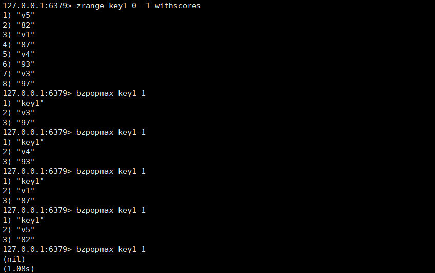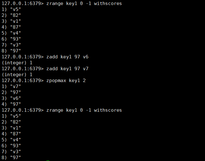 这个指令用于删除并且返回分数最高的元素,如果没有使用count则只删除一个,如果使用count可以删除count个(元素足够的情况下),返回值包括member和score。
