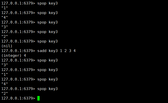 spop:spop删除元素的时候是随机删除,count不写的时候代表只删除一个,如果count有指定的话,写几个就删除几个,除非集合元素没有比count大。