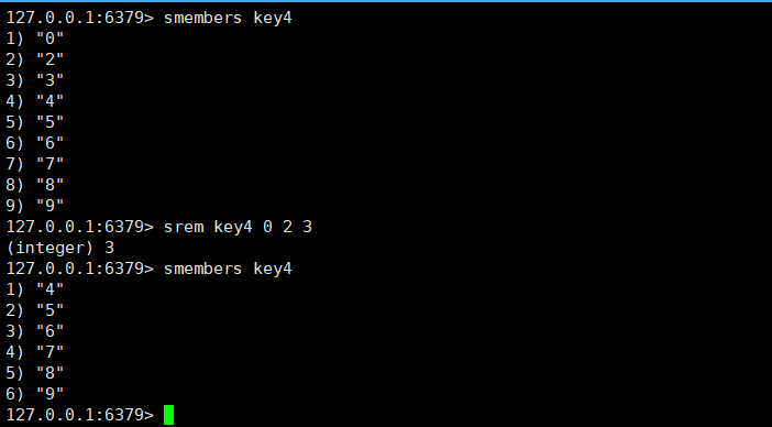 srem:可以对集合中的元素进行删除,返回值表示删除成功的元素个数。