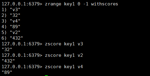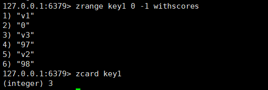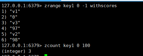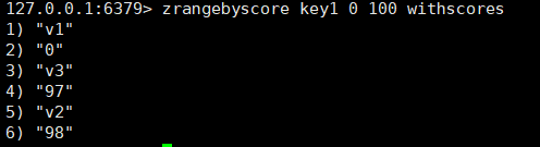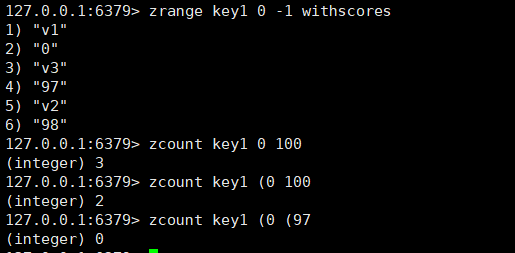 zrangebyscore:按照分数来找元素,zcount是查找min和max区间内元素的个数,而这个命令是将这些元素都打印出来。