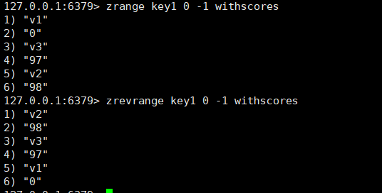 zrevrange:用于获取start和stop中间的元素,并且以逆序的形式展示,如果加上withscores选项,在展示元素的时候,元素的下一行就是元素的分数。