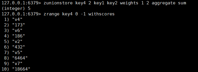 - weights指的是权重:有序集合是有权重的,可能key1权重为1,也就是key1的所有member的分数都乘以1,key2权重为19,也就是key2的所有member的分数都乘以19,以此类推,表示有序集合的重要程度。