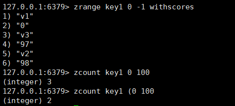 zcount :返回分数在min和max之间的元素个数,默认是一个闭区间的,如果想要开区间,那么可以加上括号。