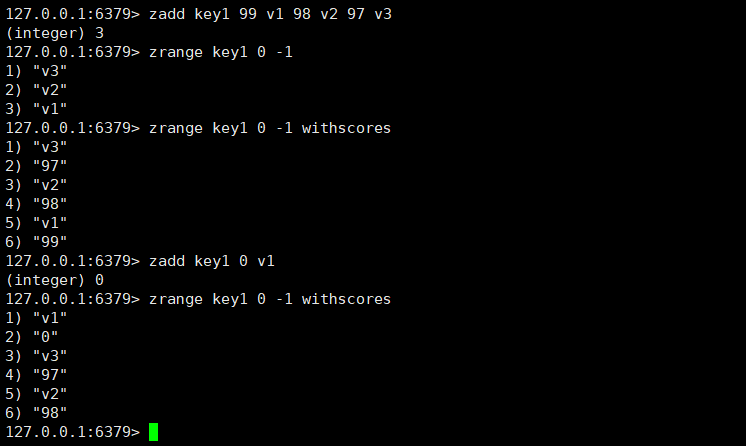 - XX和NX:当不加NX和XX选项的时候,不存在的member就新增,存在的member就更新。XX表示当member存在的时候才会更新,member不存在则不进行操作。NX表示当前不存在的才会新增,如果存在就不进行任何操作。
