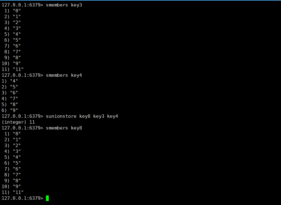 sunionstore:功能类似于sunion,但不再是以返回值的方式告诉我们了,而是可以存储到destination里。