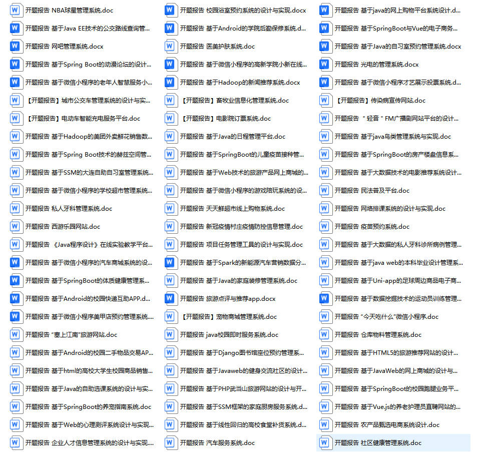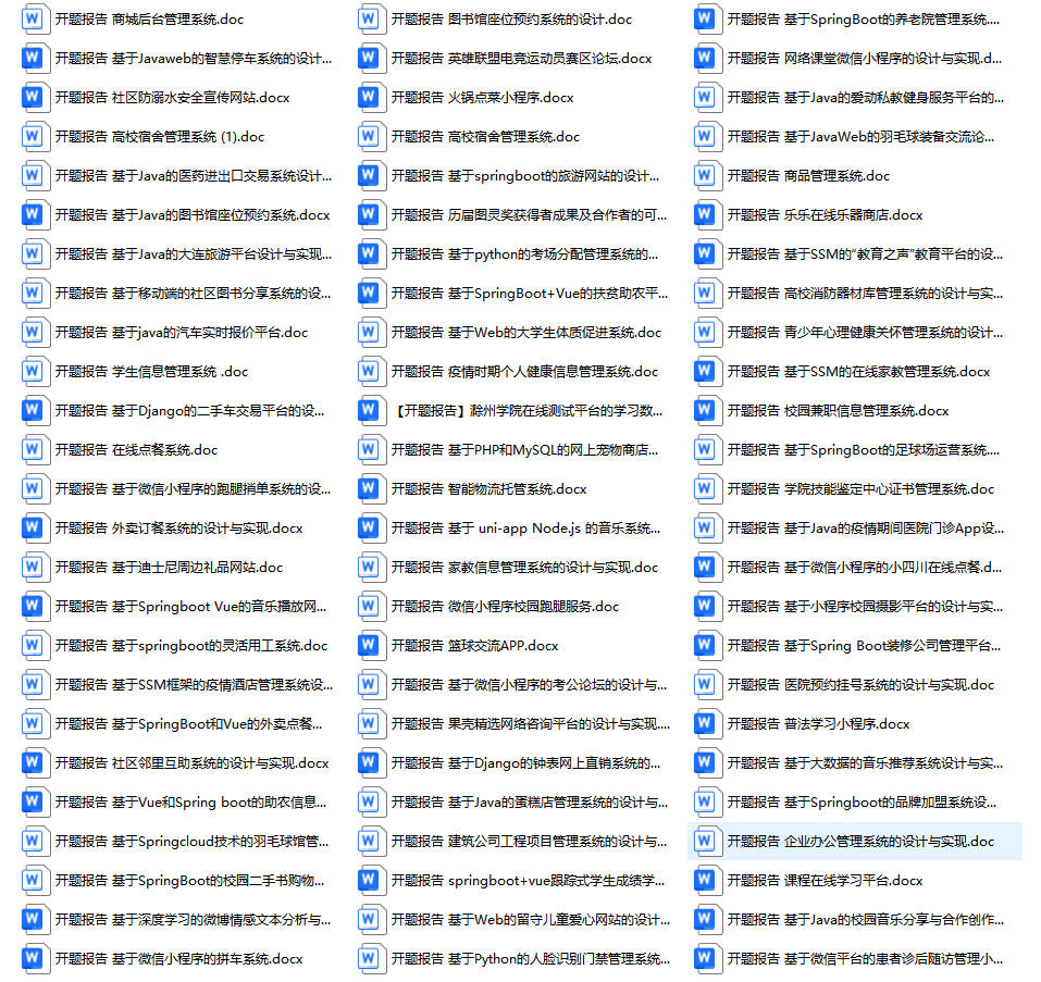 以上是某同学的毕业设计答辩的过程,如果你现在还没有参加答辩,还是开题阶段,已经选好了题目不知道怎么写开题报告,可以下面找找有没有自己符合自己题目的开题报告内容,列表中的开题报告都是往届真实的开题报告,可发送使用或参考。文末或底部来联xi可免费获取